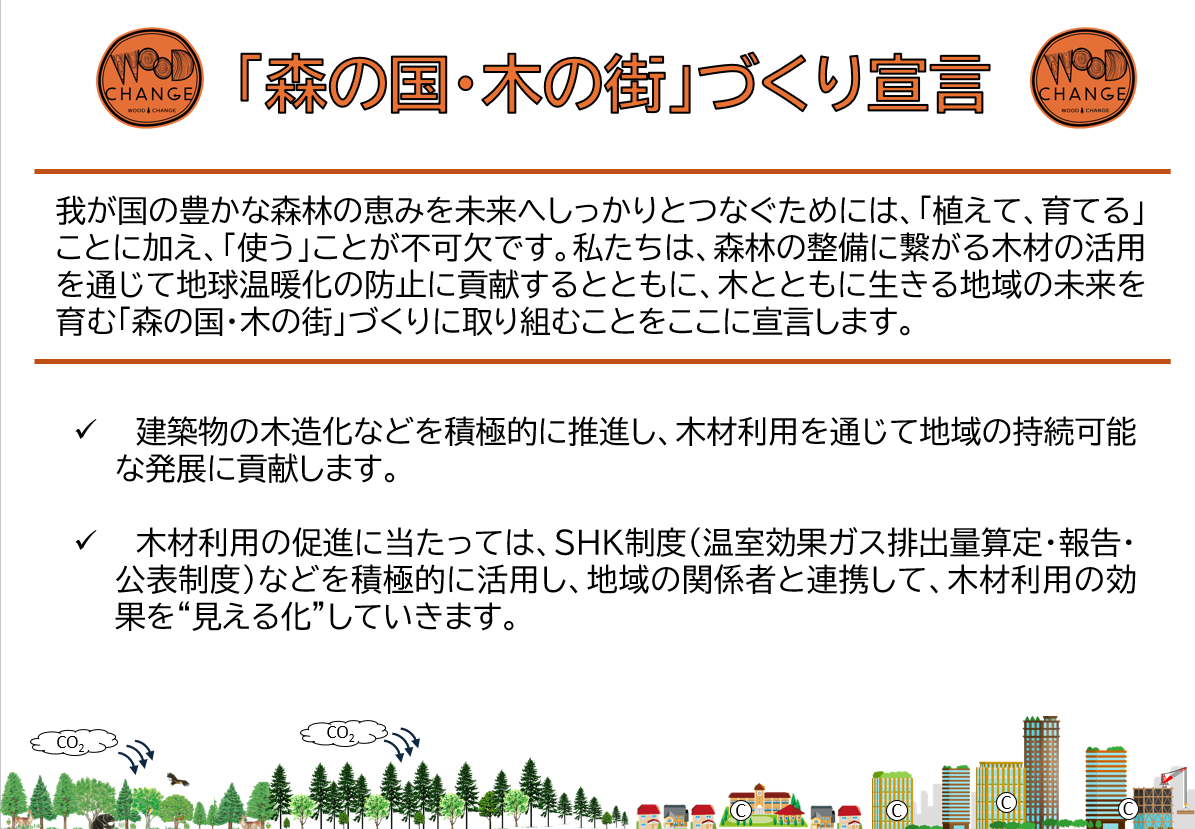 東京都においても「『森の国・木の街』づくり宣言」を宣言し、「森の国・木の街」づくりの推進にあたり、建築物の木造化などの木材利用の推進や、木材利用の効果の見える化に取り組んでまいります。