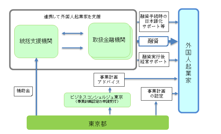 東京都は、外国人が東京で起業しやすい環境の整備を図るため、外国人起業家に向けて、 金融機関による融資と、融資前後の経営支援を組み合わせた取組を、経営支援等を実施する事業者 (統括支援機関)及び融資を行う金融機関(取扱金融機関)を通じて実施します。(融資実行は2024年3月まで)