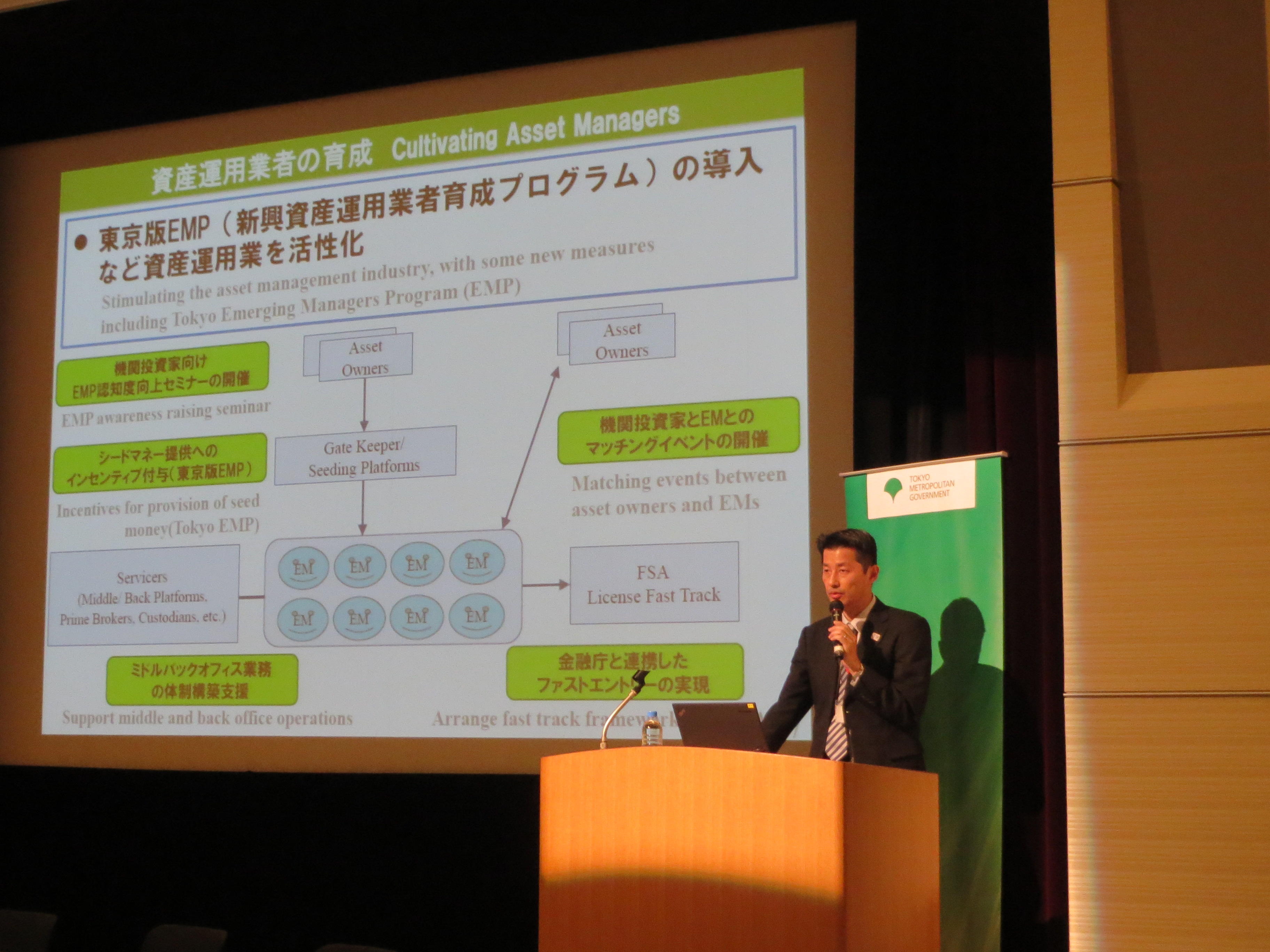 新興資産運用業者育成プログラム(EMP)※等の導入促進に向け、EMPの認知度向上を図るとともに、資産運用業者と国内機関投資家等との交流を図るセミナーを開催しています。