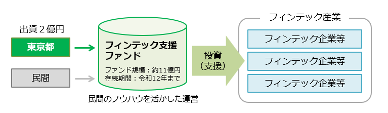 フィンテック支援ファンド事業は、都内で革新的な取組を行うフィンテック企業を中心に分散投資を行い、官民連携ファンドのスキームにより都の出資を呼び水としたフィンテック企業に対する民間資金の供給拡大や、投資先のフィンテック企業の成長による社会的課題の解決を目指す取組です。