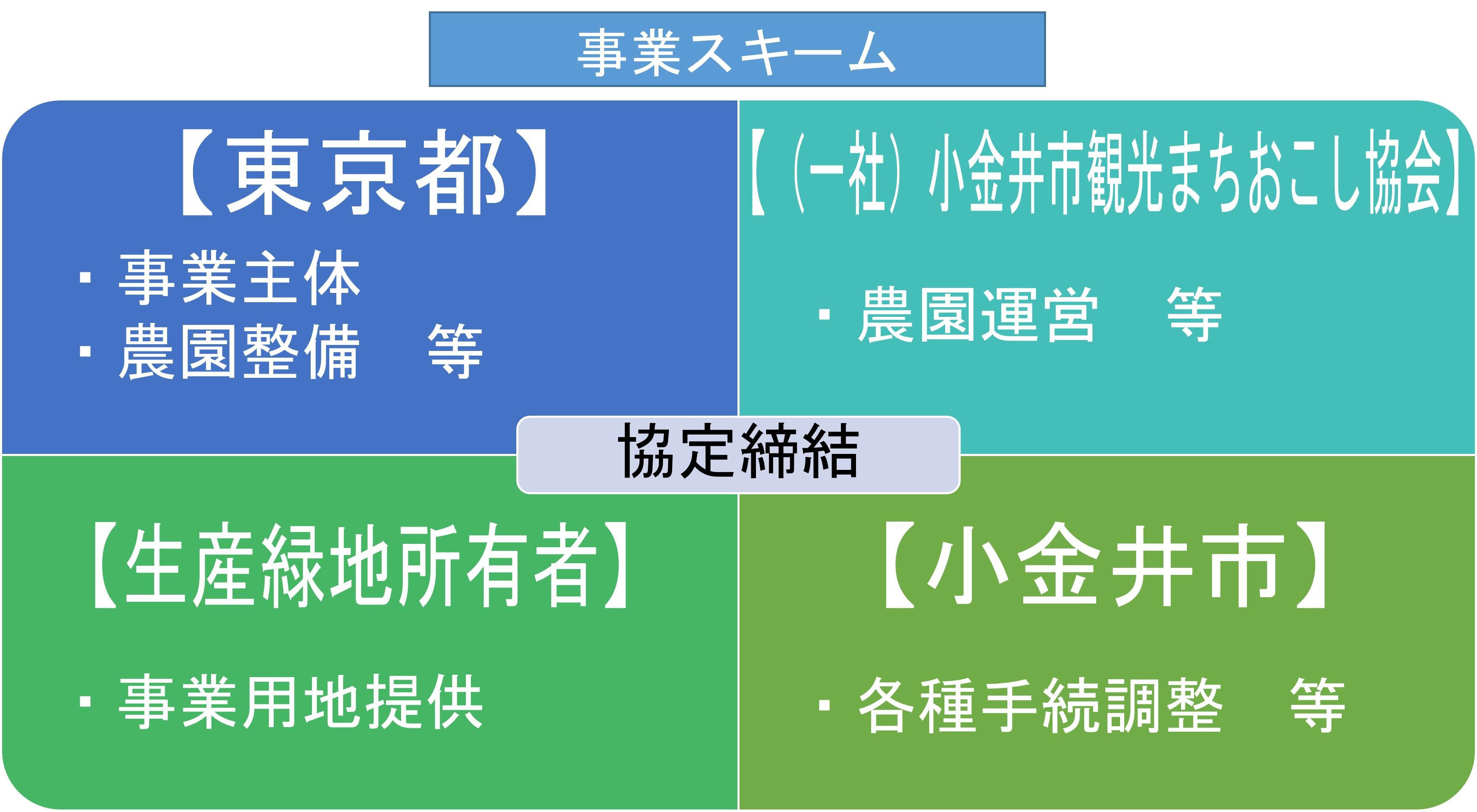 本事業は、東京都、(一社)小金井市観光まちおこし協会、生産緑地所有者、小金井市の4者で協定を締結し、協働により実施しています。