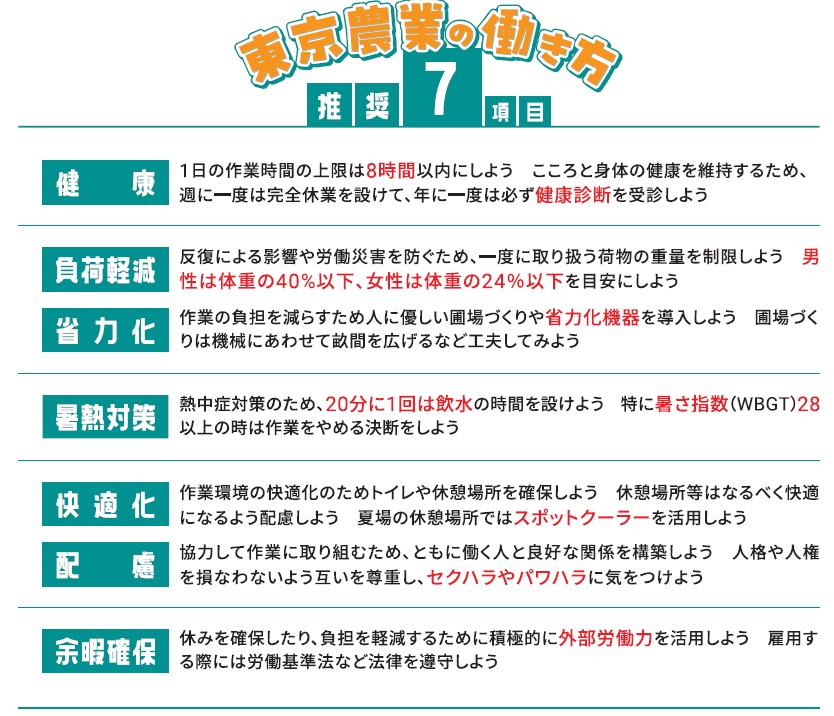 本ガイドラインは、都内全ての農業者が目指すべき方向性を示すことにより、東京農業に携わる方々が健康で意欲的に働き続けられる環境を整え、農業の魅力を高め、次世代へつなげていくことを目的としています。東京農業の働き方 推奨7項目