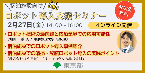 | 宿泊施設向けロボット導入支援セミナー | 令和8年2月26日(木) | 令和8年2月27日(金) | |